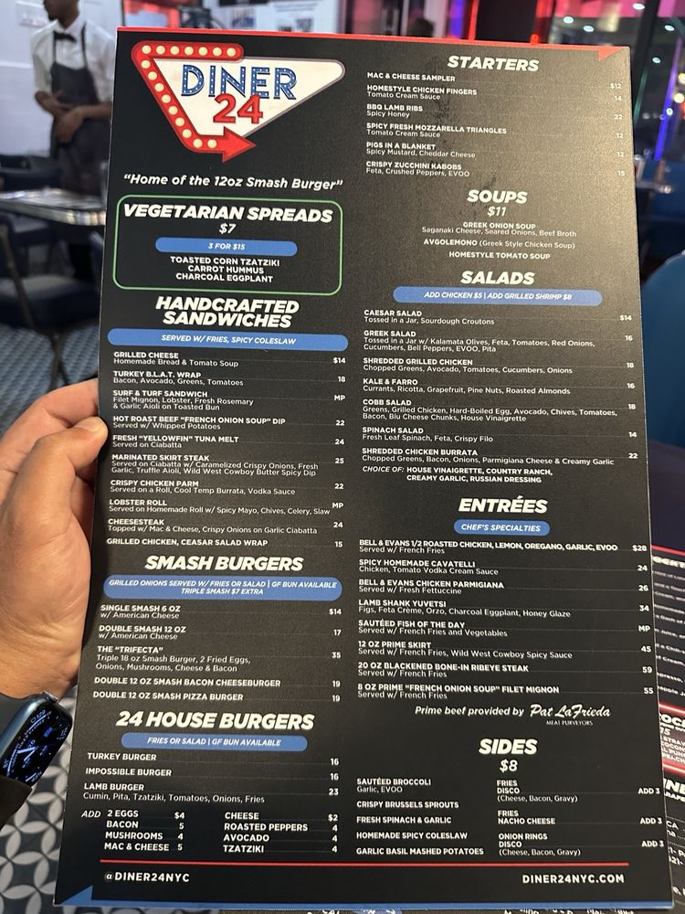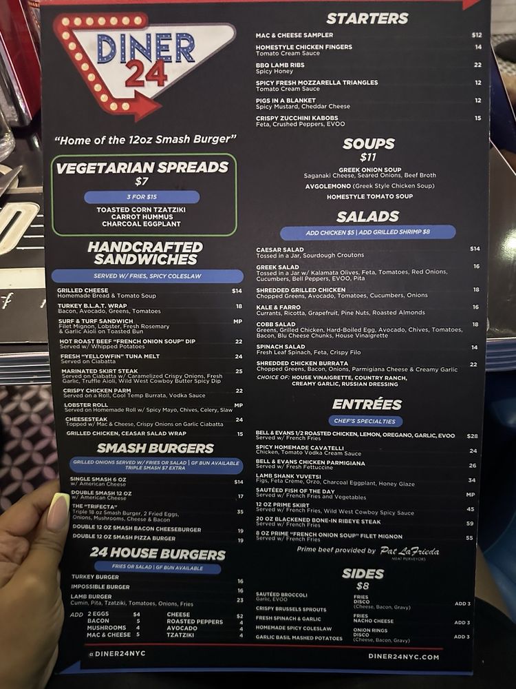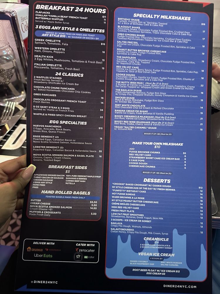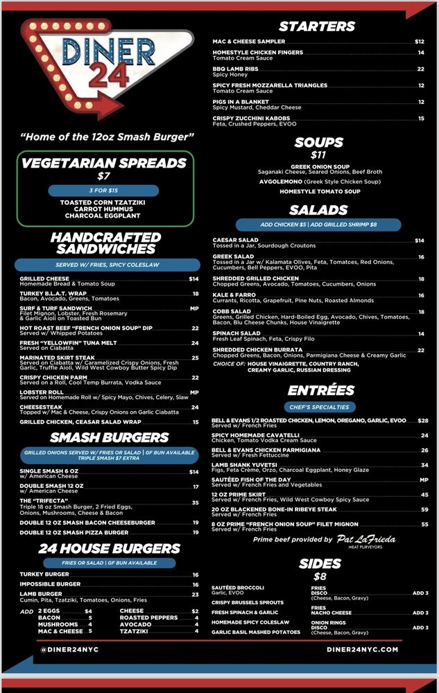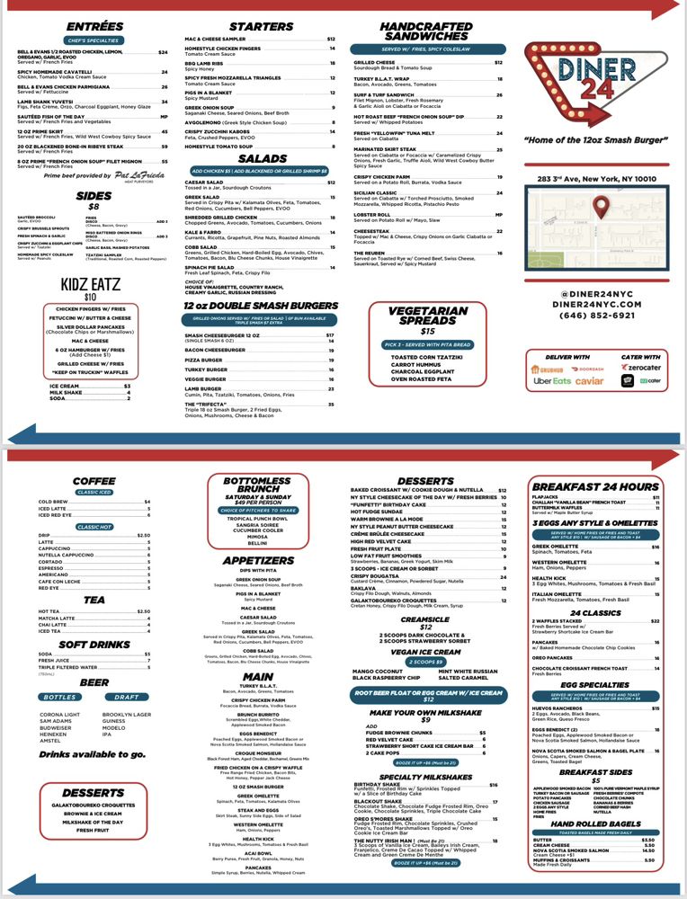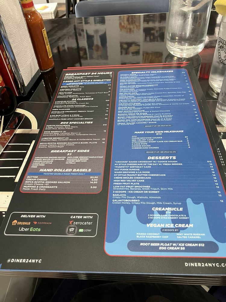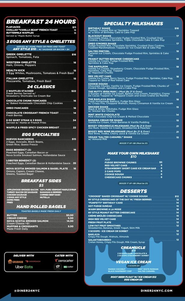 Diner 24, a popular 24-hour diner in Manhattan, offers a diverse menu featuring burgers, cocktail bars, breakfast, and brunch options. Located at 283 3rd Ave in New York, this establishment provides various amenities such as delivery, takeout, reservations, wheelchair accessibility, and more. Customers rave about the authentic diner ambiance and excellent service. Standout dishes include Greek salad, pasta, and the Reuben sandwich. The expansive menu offers options like Boozy Milkshakes and Hot Chili Oil Mozzarella Squares. With a retro diner vibe and delightful milkshakes, Diner 24 is a go-to spot for late-night cravings. Whether you're craving comfort food or a late-night snack, Diner 24 has something for everyone.